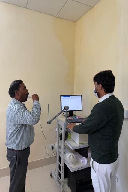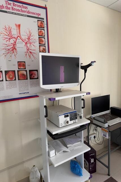 A wide range of diagnostic and therapeutic procedures are routinely performed, including pulmonary function testing, ultrasound-guided thoracentesis, intercostal drainage, fine- needle aspiration cytology (FNAC), lung biopsy, and other advanced interventions. The department is equipped with an advanced flexible video bronchoscope, and procedures such as bronchoalveolar lavage (BAL), bronchial brushing, and transbronchial needle aspiration (TBNA) are regularly conducted.