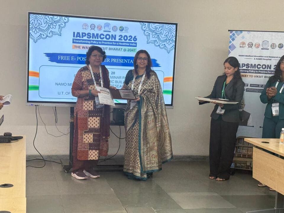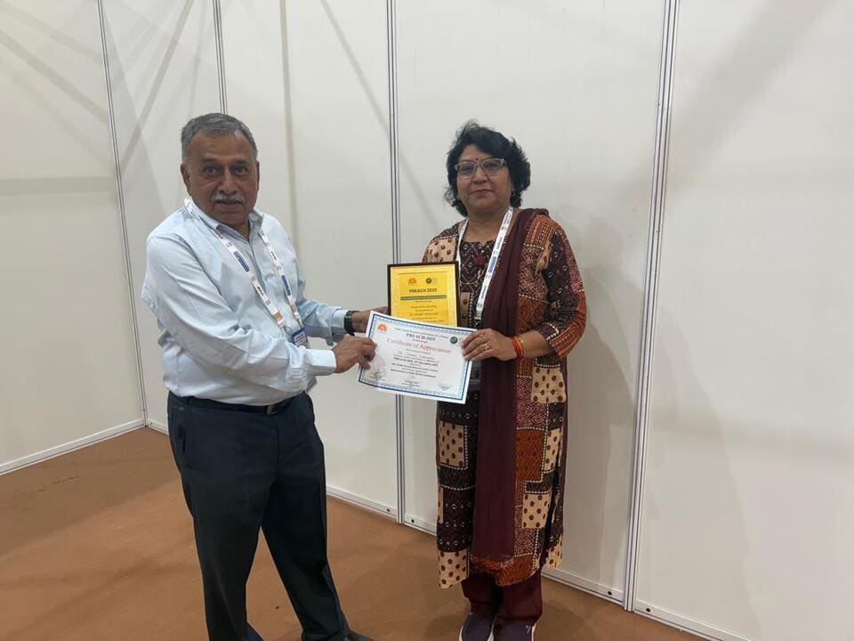 Dr. Shobha Chaturvedi Associate professor, community medicine received an award at the National Conference IAPSMCON 2026 Gujrat as contributor and reviewer in PREACH 2025 (Public Health Research and Evidence for a Change), organized by the State Health System Resource Centre, Gujarat, with technical support from the Indian Institute of Public Health, Gandhinagar.